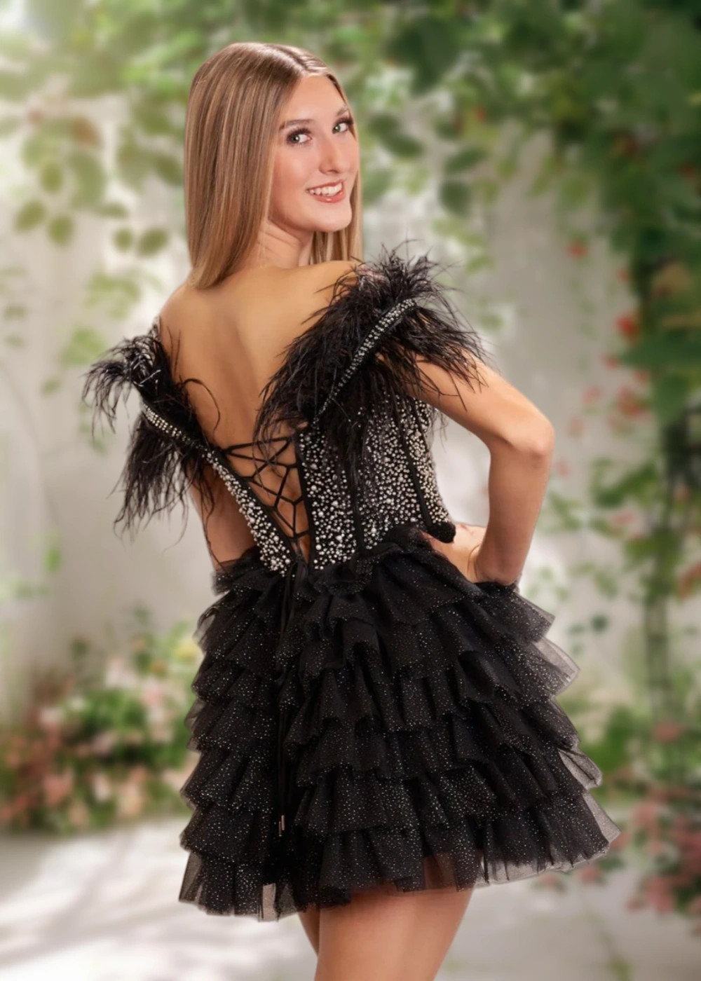Elevate your style with this stunning Black Cocktail Dress! Designed as an off the shoulder cocktail dress, it features a corset silhouette to accentuate your figure, paired with eye-catching feather details for a glamorous touch. Crafted from quality sparkling sequins and soft tulle, it balances style and comfort. Offered at an attractive price, plus part orders enjoy free shipping! Perfect for special events, this corset cocktail dress with feather elements ensures you stand out effortlessly.
