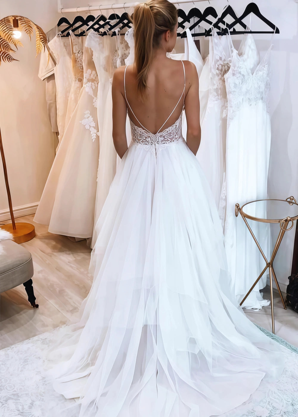 This dress features a romantic and airy design that is perfect for the free - spirited bride. The delicate lace detailing on the bodice adds a touch of elegance, while the plunging V - neckline creates a bold and alluring look. The back of the dress is equally captivating, with its open - back design and intricate lace patterns. The layers of soft tulle in the skirt give it a flowing and ethereal appearance, making you feel like a fairy - tale princess on your big day.
