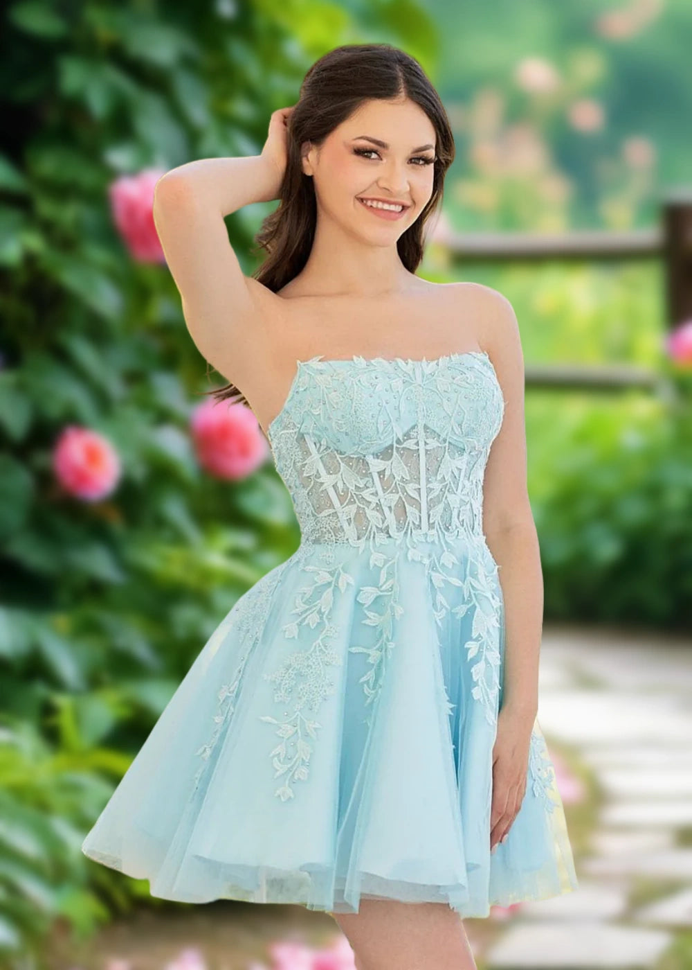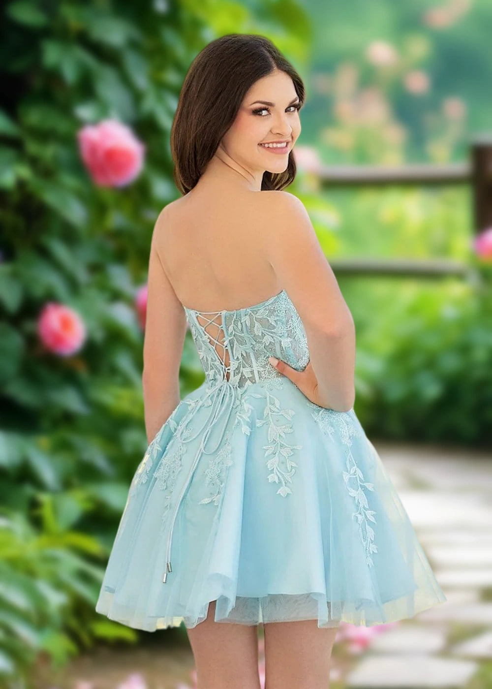 Elevate your homecoming look with our exquisite Turquoise Strapless Corset Homecoming Dress. The captivating turquoise hue offers a fresh, vibrant charm, perfect for making a statement. Designed as a strapless style, it highlights your shoulders and neckline, while the corset back with lace-up detailing ensures a flattering, customizable fit. Crafted from delicate lace and airy tulle, the dress combines intricate floral embroidery with a playful, flared silhouette. Priced to suit various budgets, it’s a fantastic blend of elegance and affordability. Plus, enjoy free shipping on select orders—your dream homecoming dress is just a click away!