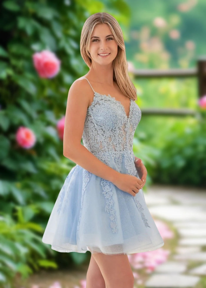 Searching for an eye-catching homecoming dress? Our Light Blue Corset Lace A Line Homecoming Dress fits the bill! Available in light blue, lavender, red, royal blue, and black, it blends elegance with trend. The delicate lace detailing and corset back design exude sophistication, while the flattering a-line silhouette suits all body types. Made from soft lace and airy tulle, it ensures comfort and grace. Priced affordably, with free shipping on select orders. Rock this lace homecoming dress and shine at your event!