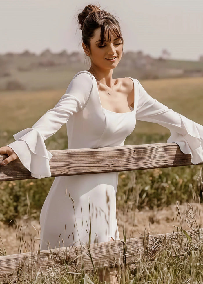 This stunning white gown features a relaxed, high-low hemline paired with a plunging open-back design, ideal for brides who want to balance sophistication with effortless style. The loose, flowing sleeves and lightweight, tiered skirt create a whimsical, romantic look that dances in the breeze. Perfect for outdoor ceremonies or beach elopements!