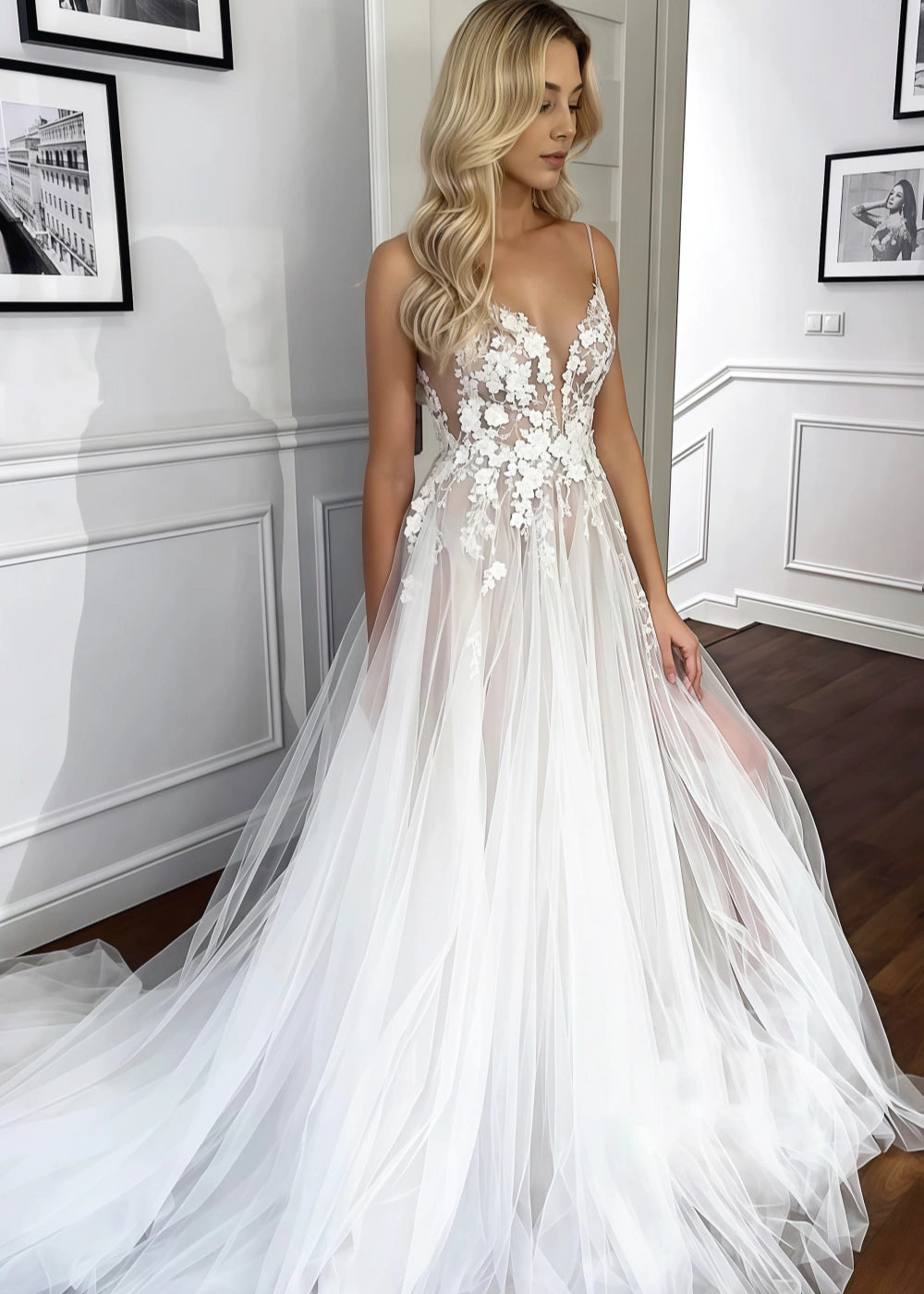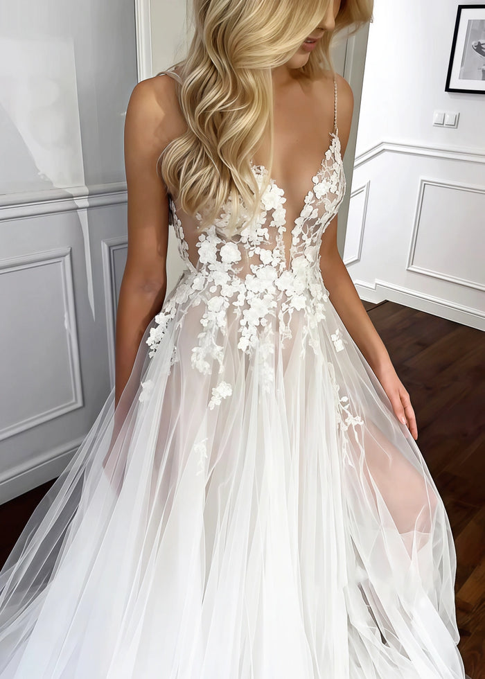 This stunning wedding dress from PromDressClub features a breathtaking design. The deep V-neck and delicate spaghetti straps add a touch of elegance and femininity. The bodice is adorned with intricate floral embroidery on a sheer fabric, creating a romantic and dreamy look that is sure to turn heads.