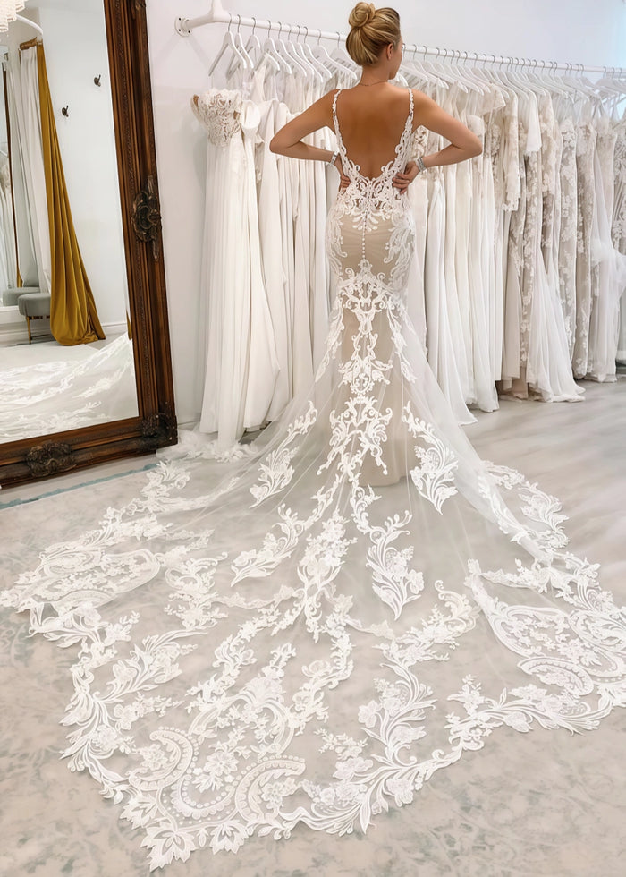 This stunning wedding dress from PromDressClub is a dream come true for brides - to - be. The mermaid silhouette hugs your curves gracefully, accentuating your figure from the bodice to the knees and then flaring out into a magnificent train. The dress is adorned with intricate lace patterns, which add a touch of elegance and romance.