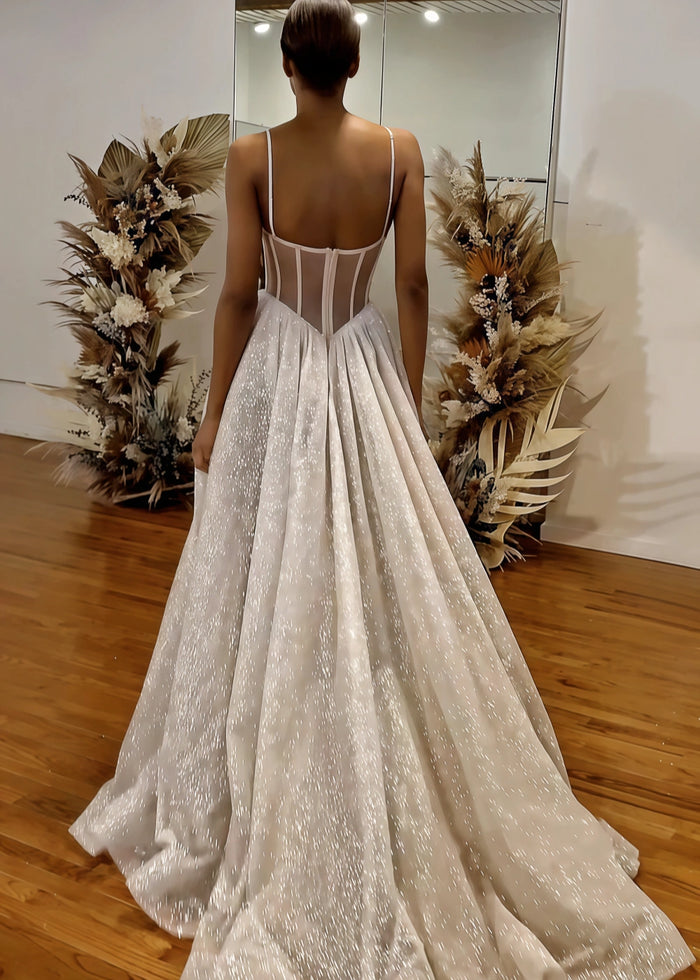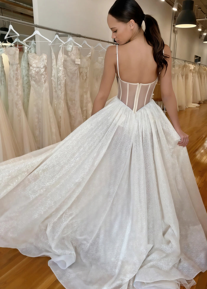 This stunning wedding dress from PromDressClub is a true masterpiece. The top features a corset - style bodice with delicate sheer panels and intricate embroidery, adding a touch of sensuality and elegance. The spaghetti straps are simple yet charming, highlighting the shoulders gracefully. The skirt is a voluminous A - line with a high slit, made of a shimmering fabric that catches the light beautifully as you move. It's a perfect blend of modern and classic styles.