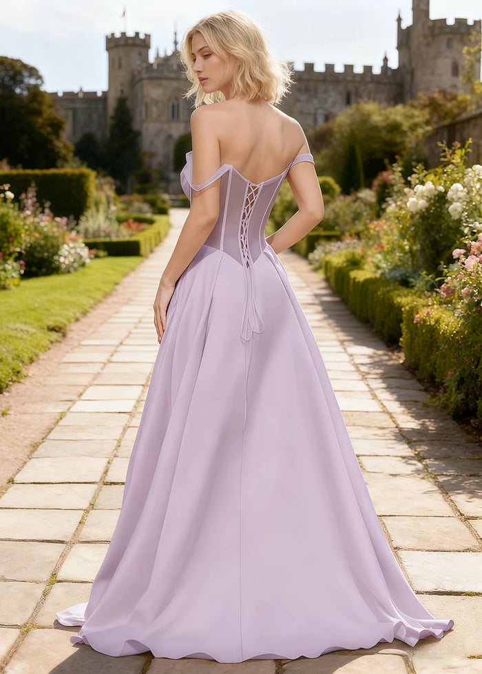 Meet your dream purple satin prom dress corset! This beautiful black gown is both elegant and comfortable. The off-the-shoulder top has a corset style that fits you nicely. At the back, a lace-up design lets you adjust the dress for a perfect fit. The long skirt is made of shiny satin and light tulle, so it flows gracefully when you move. It also has a high slit to add a touch of charm. Plus, the dress is fully lined inside, making it soft against your skin. Ideal for proms, parties, or weddings, this dress will help you shine on your special night!
